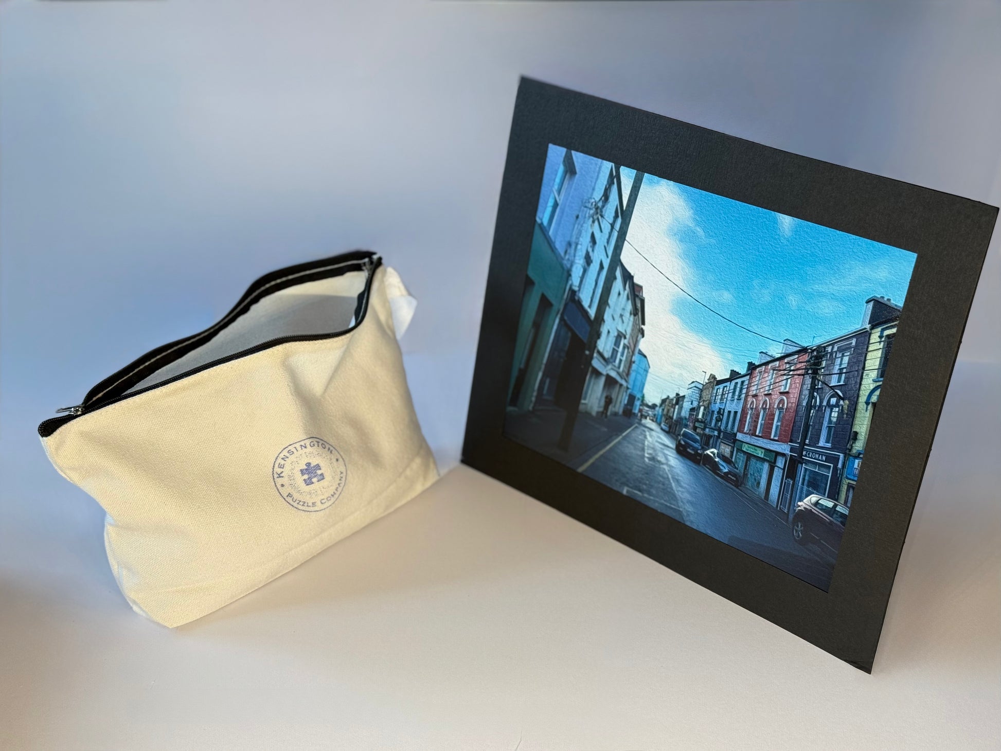 Each Kensington Puzzle arrives in a cloth bag with two 8"×10" gallery-quality prints and a stand-up frame for easy viewing as you puzzle. Our box-free design reduces clutter and elevates the beauty of your space, offering a more thoughtful and peaceful puzzling experience.